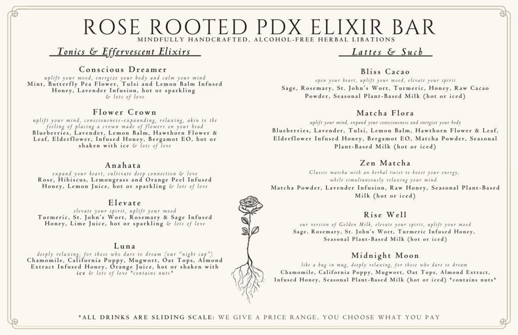 Your new favorite evening gathering space in the heart of NE Portland offering a cafe and lounge-like atmosphere that encourages connection, nervous system regulation, and feelings of euphoria through non-alcoholic herbal-based beverages, sober/sober curious events, experiences and workshops.